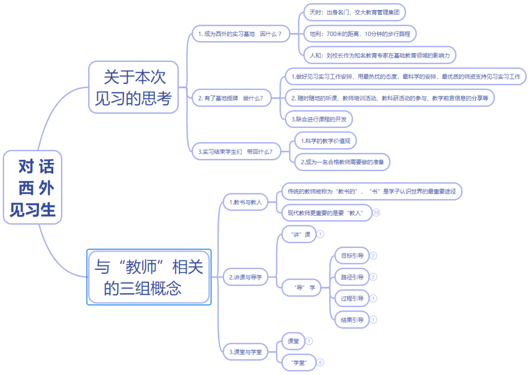 学生“自我管理、自主学习”能力建设,是交大教育管理集团培养孩子具有可持续发展终身学习力的的重要内容。我校语文教师刘鑫,同时也是西北大学应届研究生,以大半年的工作经历,在交大教育集团教师培养体系的科学培养和级组长的带领下,快速成长,在如何培养学生自主学习、自我管理的工作实践中,带领一群六七岁的小朋友,在小组合作分级负责的机制探索中,将纪律、学习、保洁等各项班级事务管理,全部纳入“学生自管自纠、教师考核激励”的分工负责制之中。她的分享带给了西外实习生一个鲜明的导向:好的平台、好的工作机制、个人的勤奋努力,在做完和做好之间选择后者,就可以成就单位、成就自我。听讲的大学生们充满了钦佩与好奇:现在小学生都可以自我管理了吗!