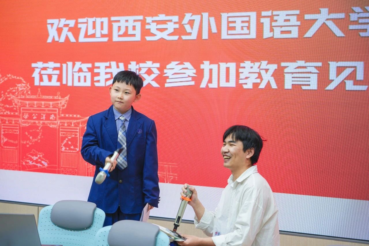 我校领导带领见习生们参观校园并介绍了学校的办学理念。西外实习生对我校校园文化既有传统文明底蕴、又不乏现代时尚气息的特色赞叹不已,对校园文化处处彰显的人文关怀倍感亲切!